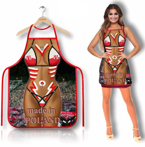 Pokaż światu, że polska dusza potrafi być naprawdę ognista! Ten fartuch Made in Poland to połączenie humoru, seksapilu i patriotycznego temperamentu. Realistyczny nadruk bikini w barwach narodowych, białe akcenty stylizowane na body paint oraz tłum kibiców w tle tworzą wyjątkowo zadziorny efekt, który rozgrzeje atmosferę w każdej kuchni.