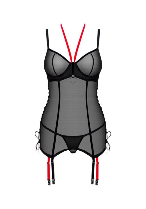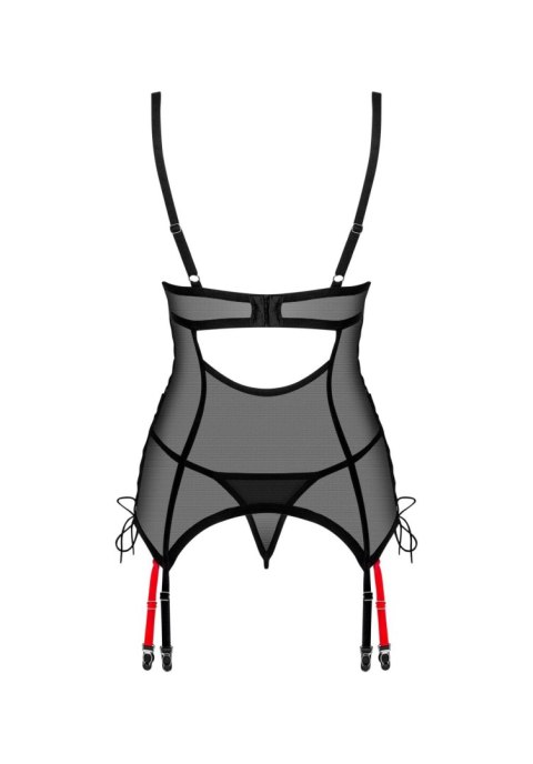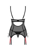Zrób oszałamiające wrażenie w gorsecie i stringach Glandez. Delikatny, prześwitujący materiał w czarnym kolorze zestawiono z intensywnie czerwonymi akcentami, które z pewnością nie pozwolą oderwać od Ciebie wzroku! Zasmakuj upojnych chwil i pozwól sobie na nowe doznania.