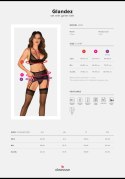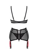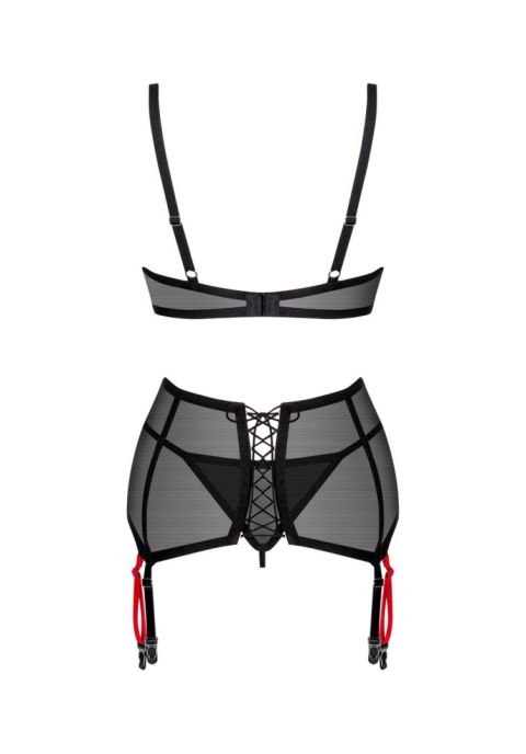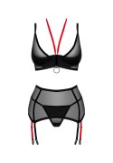 - czarny komplet bielizny, w skład którego wchodzą pas do pończoch, biustonosz oraz stringi
