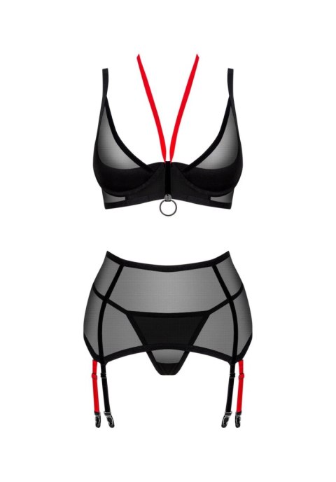 - czarny komplet bielizny, w skład którego wchodzą pas do pończoch, biustonosz oraz stringi