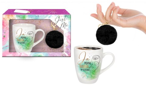 JUST ME - zestaw kubek baryłka 300ml+pompon czarny-Ja piękna, mądra, wyjątkowa