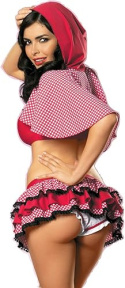 4 cześciowy kostium Czerwonego Kapturka wykonany z elastycznego materiału w biało-czerwonych kolorach z dodatkiem krateczki. 100 % kobiecości zapewnia krótka spódniczka z falbankami, zapinany na guziczki top oraz białe figi obszyte czerwoną wstążką i falbankami. W komplecie, wiązana na szyi, pelerynka.