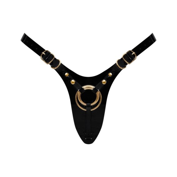 Inspirowana klasycznymi stringami, ta uprząż została zaprojektowana jak biżuteria na ciało - z błyszczącym wykończeniem w stylu „patent" i minimalistycznym krojem, który eksponuje pośladki z niezwykłą finezją.