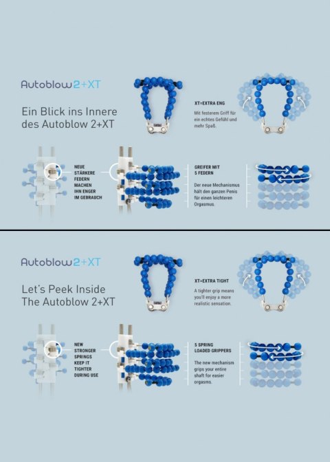 W pełni automatyczny masturbator z mocnym silnikiem przemysłowym 230 V. Jedwabisty rękaw z otworem na usta jest szczelnie zamknięty wewnątrz masturbatora przez 5 sprężystych ramion kulkowych. Poruszają się one zmysłowo w górę i w dół podczas stymulacji, tworząc zapierającą dech w piersiach intensywną przyjemność. Prędkość masażu jest regulowana bezstopniowo za pomocą pokrętła. Tuleję można wyjąć z obudowy w celu wyczyszczenia. Dodatkowe rękawy z otworami na waginę i odbyt są dostępne jako akcesoria (nie są dołączone). Zasilanie sieciowe. Dołączona wtyczka Euro.
