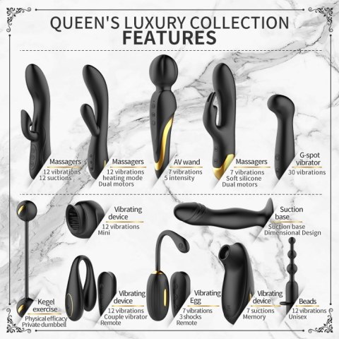 Idealny na zabawną noc z partnerem. Daj się rozpieszczać naszym 12-częściowym zestawem Golden Black Couple's Set (QUEEN'S LUXURY COLLECTON). Zaskocz swojego partnera tym pudełkiem smakołyków i spędź zabawną noc dla was obojga. Ciesz się kulkami analnymi, które łaskoczą twoje tylne drzwi, pokrowcem na kutasa do niesamowitej stymulacji wewnętrznej, wielobiegowym wibratorem punktu G, kulkami Ben Wa zapewniającymi całodzienną przyjemność i pierścieniem na penisa napędzanym kulami, który zapewnia wibracje wywołujące orgazm Tobie i Twojemu partnerowi i jeszcze kilka do odkrycia. Mając tak wiele do wyboru, będziesz wracać do tego zestawu od czasu do czasu.