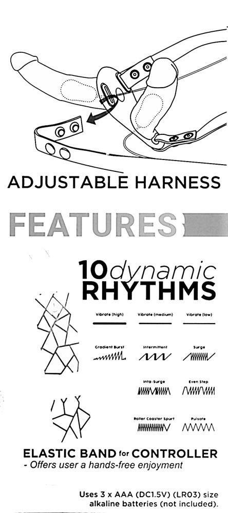 Czarny wibrator strap-on z dużym wibratorem na zewnątrz i małym wibratorem wewnątrz. Duży wibrator (dł. 17 cm, średnica 3-4,3 cm) jest lekko zakrzywiony i służy do penetracji części pasywnej, mały wibrator (dł. 9,3 cm, średnica 3,8-4,2 cm) służy do penetracji własnej (część aktywna). Oba wibratory z wyraźną żołędzią i zaznaczonymi żyłkami oraz 10 trybami wibracji, sterowanymi za pomocą przewodowego pilota, który można wpiąć w małą pętelkę na pasie biodrowym, dzięki czemu ręce pozostają wolne. Obwód pasa biodrowego jest regulowany w 12 stopniach od 78 cm do 108 cm, stringi mają 96 cm długości i są płynnie regulowane. Baterie prosimy zamawiać osobno: 3x Micro/AAA.