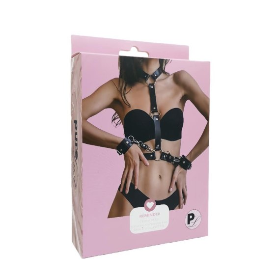 Zestaw obejmuje opaski na nadgarstki, które można połączyć bezpośrednio z uprzężą, wzmacniając wrażenie podporządkowania i intensyfikując erotyczną dynamikę.