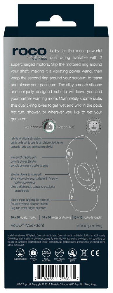 Innovative vibrating cock ring with clitoris attachment and additional testicle ring with perineum stimulator. 2 powerful motors that are separately adjustable. 10 whisper quiet vibration modes provide lots of variation. Convenient Memory function that repeats the mode last used before turning the device off. With silky Soft Touch texture and practical travel lock making Roco the ideal couples toy for travelling. Rechargeable with the included USB cable.