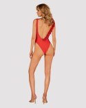 -czerwony, jednoczęściowy kostium kąpielowy z uwodzicielskim dekoltem