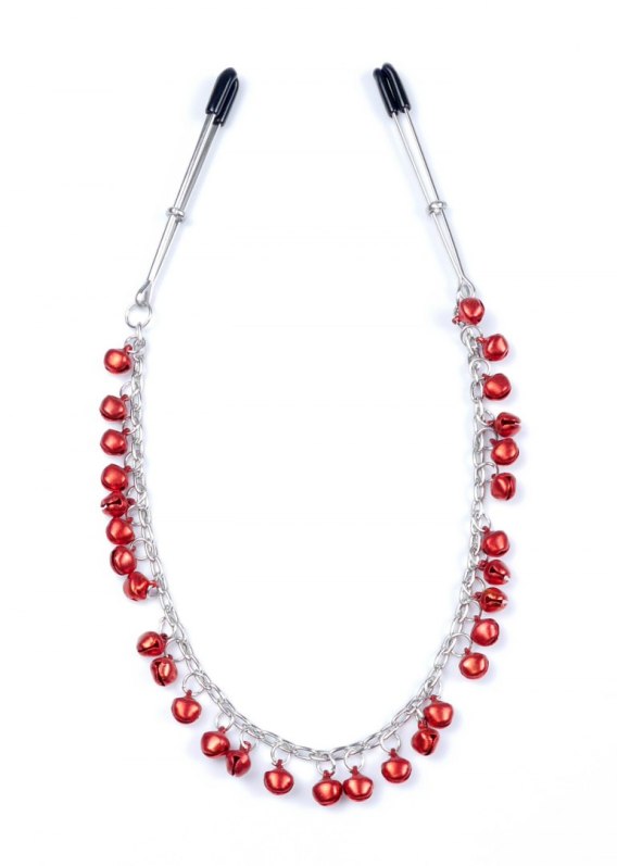 Wytrzymałe metalowe zaciski pokryte miękką gumą, te zaciski są idealne dla początkujących jak i entuzjastów. Ruchome pierścienie służą do regulacji intensywności nacisku klamry (od delikatnej do intensywnej). Elegancki łańcuszek z małymi dzwoneczkami łączy oba sutki, daje to niesamowitą stymulację przy każdym ruchu.