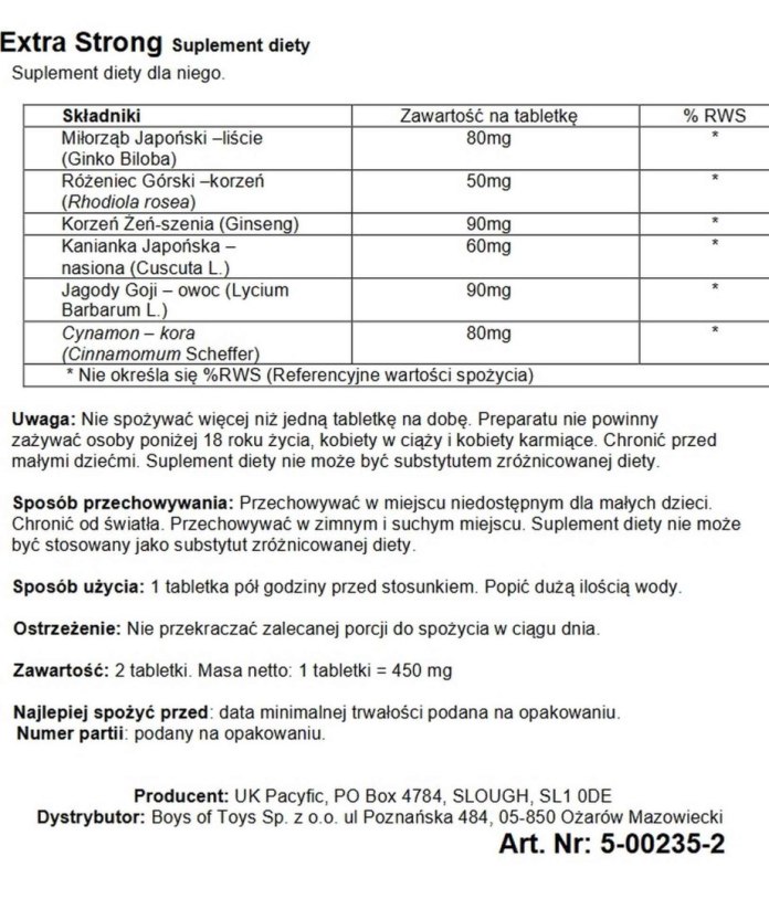 Bardzo mocny. Ziołowy suplement diety dla mężczyzn na podstawie tradycyjnej tybetańskiej receptury. Składniki pochodzą z naturalnych ziół rosnących w Himalajach 4000m n.p.m. Zwiększa wytrzymałość i utrzymuje trwałą erekcję. Poprawia wydajność. Maksymalna siła. Ziołowy suplement diety jakości farmaceutycznej. Działa w 30 minut. Brak efektów ubocznych.