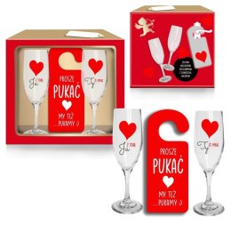 Zestaw prezentowy. 2 kieliszki z napisem "Ja z Tobą. Ty ze mną. + zawieszka z napisem - " Proszę pukać. My też... pukamy ;)"