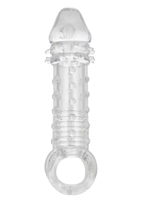 Indulge in you and your mutual satisfaction with the powerful Ultimate Extender male enhancer. While the closed-end sleeve suction and ribbed chamber thrill him, the added girth, thrilling studded texture and 2 inches of length will leave your lady shaking. The built-in scrotum strap and thick sleeve provided added erection support and increase stamina to prolong and intensify pleasure for any couple. Step up your pleasure and never settle for less when it comes to size, our super stretchy extender with supportive scrotum strap will have you and your lover craving more, more, more.Our super stretchy enhancer stretches to fit any size man. The Soft, stretchy TPE is unscented, phthalate free and maintenance free to keep your most sensitive spots, happy and healthy. Enjoy easy clean up with this maintenance free stimulator sleeve, simply wash with soap and warm water before and after each use. Use ample lubricant for easy insertion.