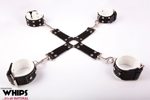 Skórzany krzyżak do krępowania rąk i nóg. Kajdanki w kolorze biało-czarnym, szerokość regulowana za pomocą masywnych klamerek.