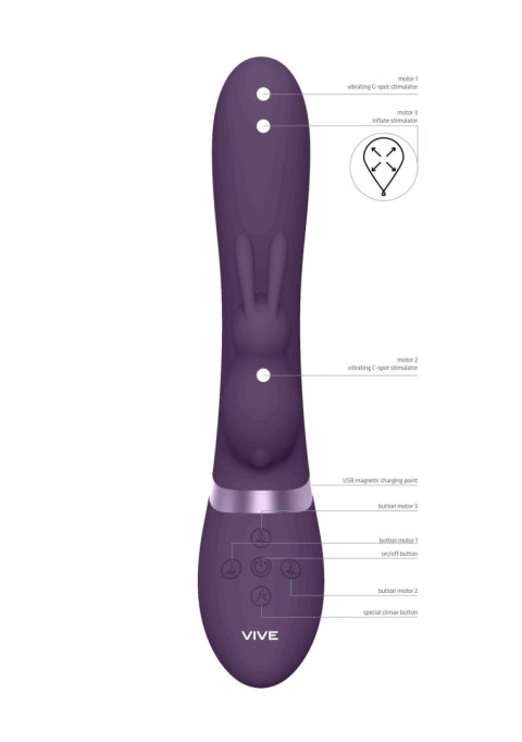 TAKA to jeden z najbardziej innowacyjnych i najmocniejszych wibratorów dostępnych dziś na rynku: wykorzystuje trzy nowej generacji silniki F1 oraz zaawansowaną technologię (umożliwiającą niezależne sterowanie wszystkimi trzema z nich).Jeden 10-funkcyjny wibrujący silnik NG F1 do stymulacji punktu G, jeden innowacyjny 10-funkcyjny silnik NG F1 automatycznego nadmuchiwania oraz jeden innowacyjny, 10-funkcyjny wibrujący silnik do stymulacji łechtaczki. Dzięki ich wykorzystaniu ten wibrator oferuje „kompleksowe usługi".Model VIVE042 pasuje idealnie do każdej osoby.A to dlatego, że to wibrujący stymulator punktu G z funkcją automatycznego nadmuchiwania.Połączenie stymulacji łechtaczki wibrującym króliczkiem oraz 100 wyjątkowych kombinacji ustawień dostarcza ekstatycznych uniesień.Zabawkę w 100% wykonano z gładkiego silikonu medycznego (który jest zarazem hipoalergiczny), jest całkowicie wodoodporna (IPX7) i niesamowicie cicha (poniżej 60 dB).Tym samym możesz jej używać, gdy tylko przyjdzie ci na to ochota! Wibrator wyposażono w akumulator litowo-jonowy ładowany z użyciem magnetycznego kabla USB.Po całkowitym naładowaniu kablem USB zabawka zapewnia 40 minut niezapomnianych zabaw.Po prostu podłącz, naładuj i baw się w najlepsze!A gdy już będziesz blisko, za jednym dotknięciem przycisku z funkcją szczytowania natychmiastowo nastawisz wszystkie silniczki na pełną moc i prędkość i, co najważniejsze, doprowadzisz się do orgazmu, który zwala z nóg.Wszystkie wibratory VIVE mają roczną gwarancję, by chronić twoją inwestycję.